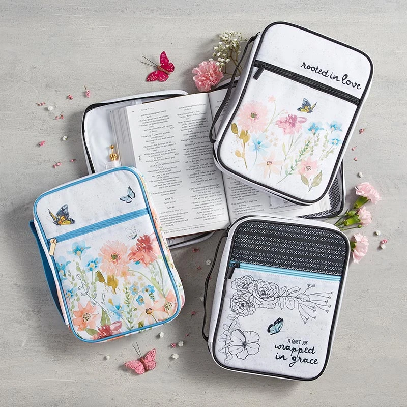 Garden Bible Cover Beautiful art by AmyLee Weeks Fits Standard-sized Bibles (6x9x1.5 or smaller) Convenient front-zippered pocket Inside includes ribbon