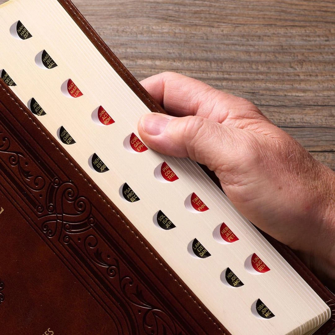 The polished Art Nouveau Framed Saddle Tan Faux Leather King James Study Bible with Thumb Index will introduce a new way of studying the classic King