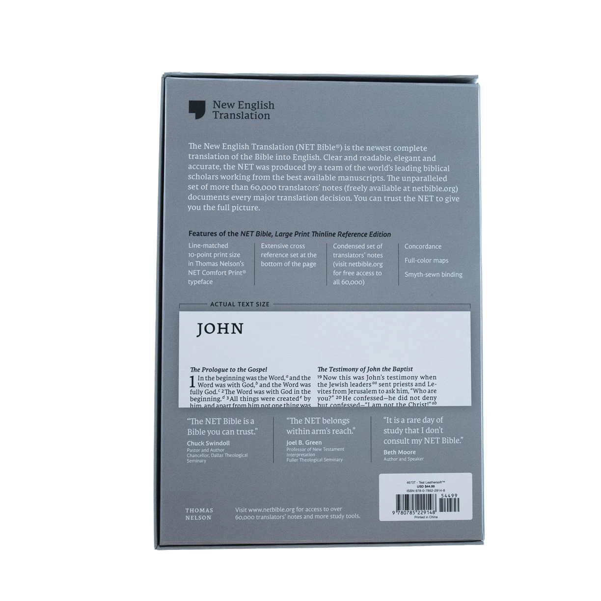 The NET Bible, Large Print Thinline Reference Edition, is both portable (under 1-inch thick) and readable. Bible text appears in a beautifully-designed line-matched double-column format, with extensive cross-references conveniently located at the bottom of the page.Featuring the New English Translation—the newest translation of the biblical languages into English, based on the most up-to-date manuscript discoveries and research—this cross-reference edition of the NET Bible is ideal for students, teachers, and lay-readers alike. Features include:Complete text of the transparent and accurate New English TranslationExtensive set of cross-references help reveal the connections within ScriptureAbbreviated set of NET translators’ notes (complete set of more than 60,000 notes freely available online at netbible.org)Durable Smyth-sewn binding lays flat in your hand or on your deskFull-color mapsThomas Nelson’s NET Comfort Print 10-point typeface