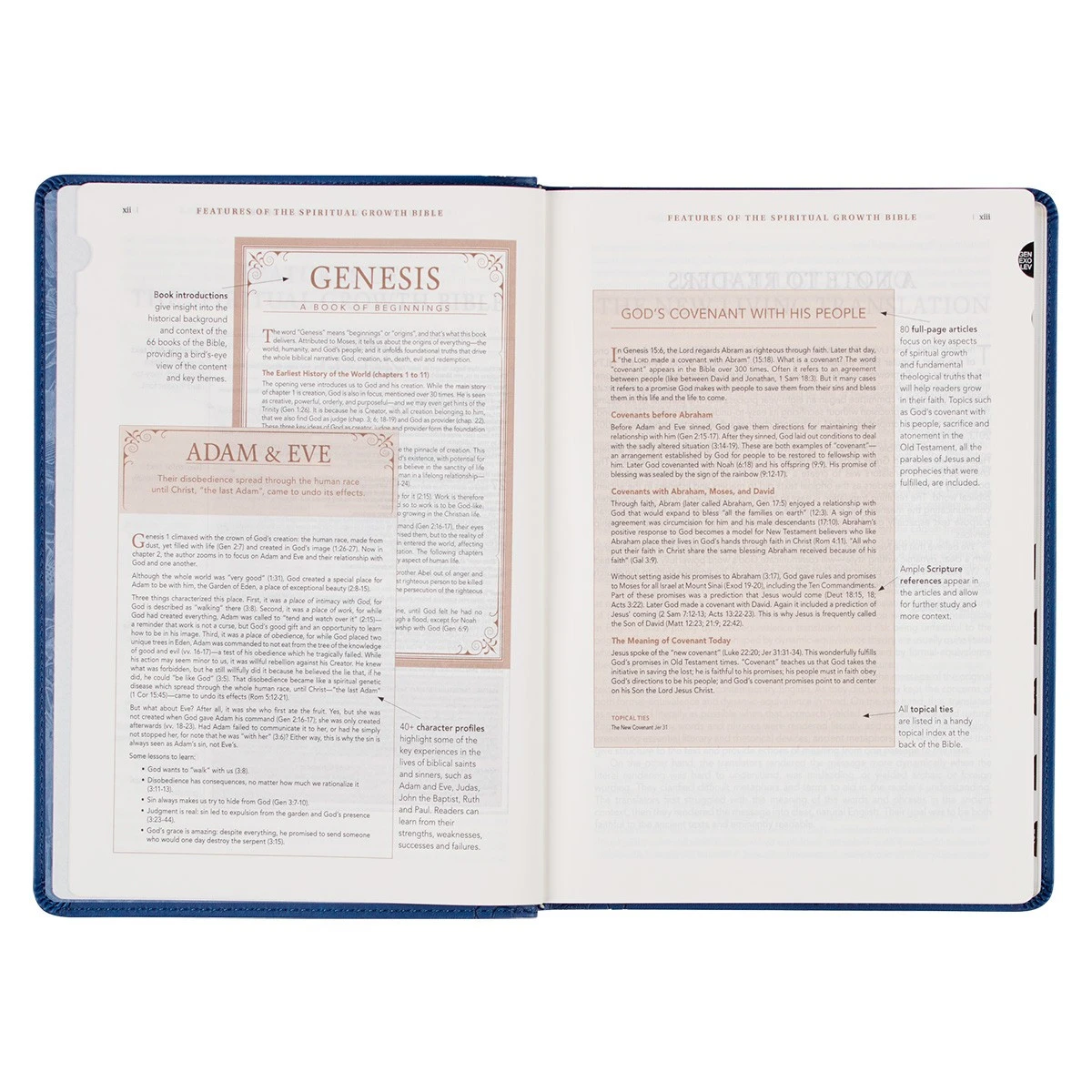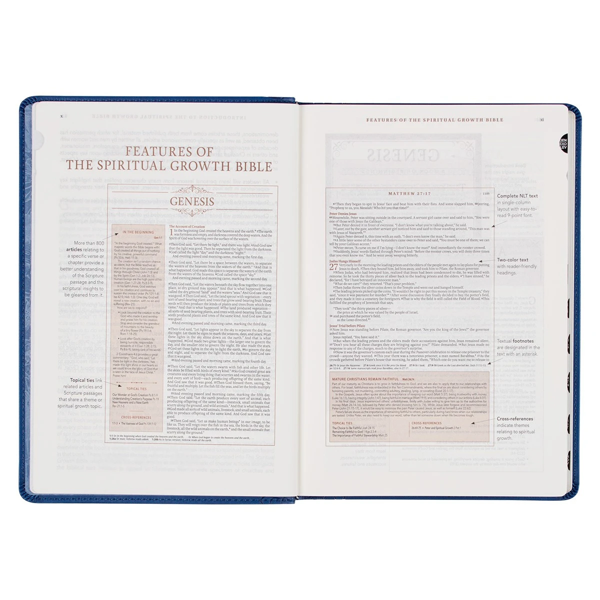 The flexible cover of the Bible opens flat to reveal the complete text of the NLT (New Living Translation). Luxury design features of this Bible include a